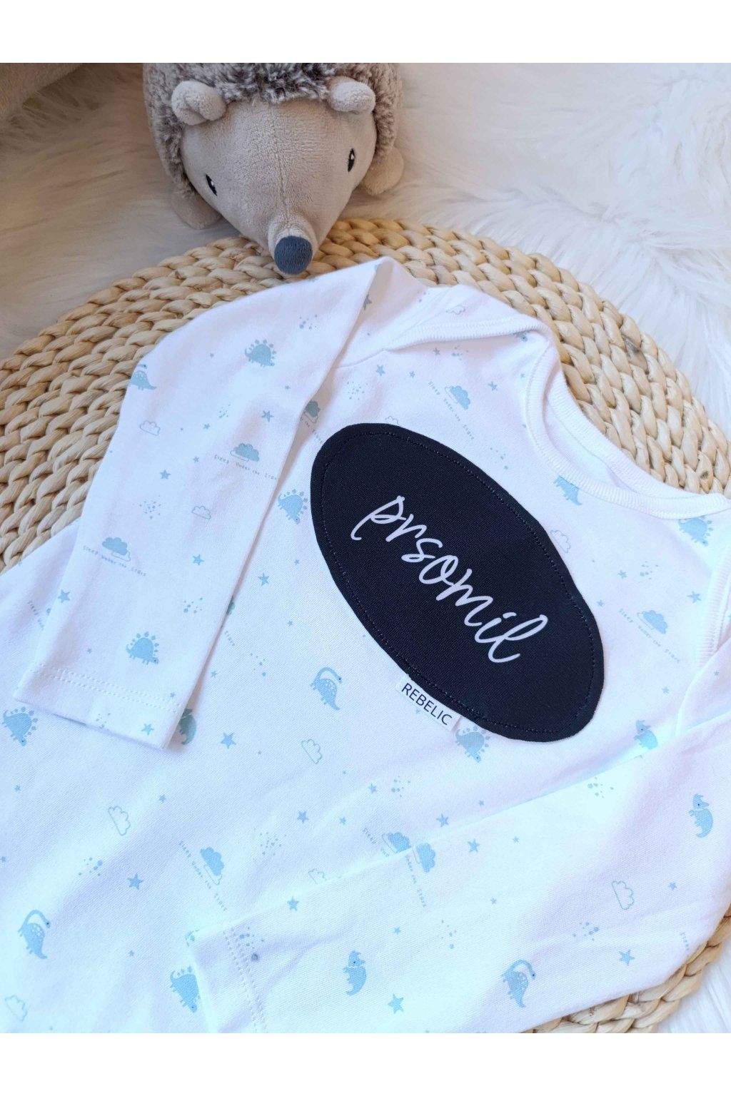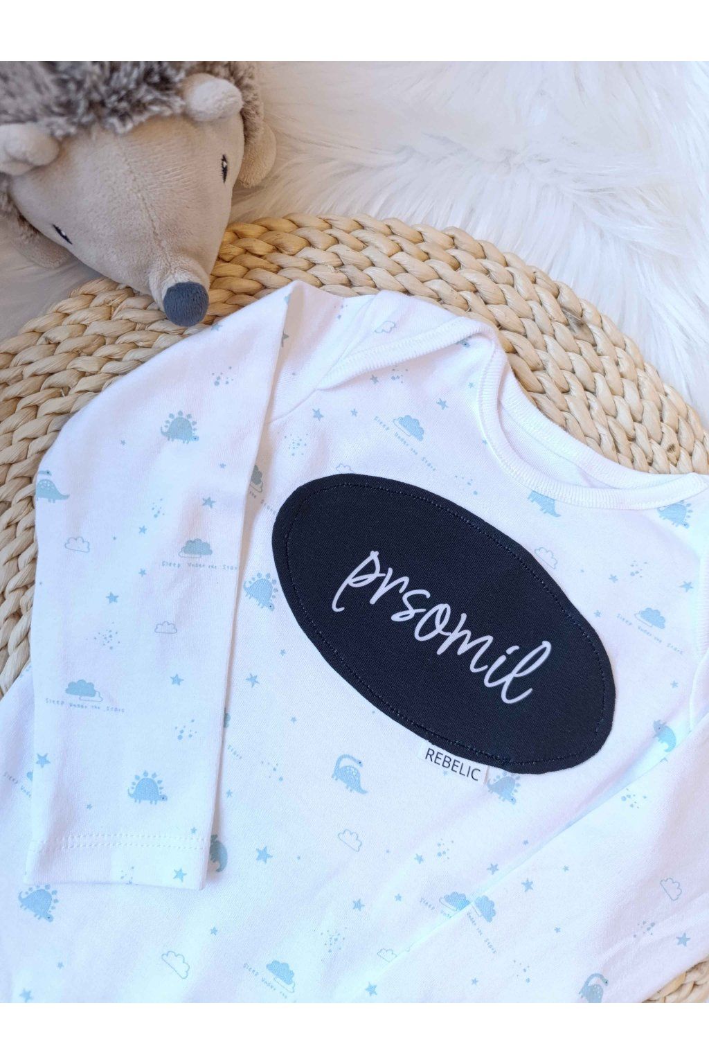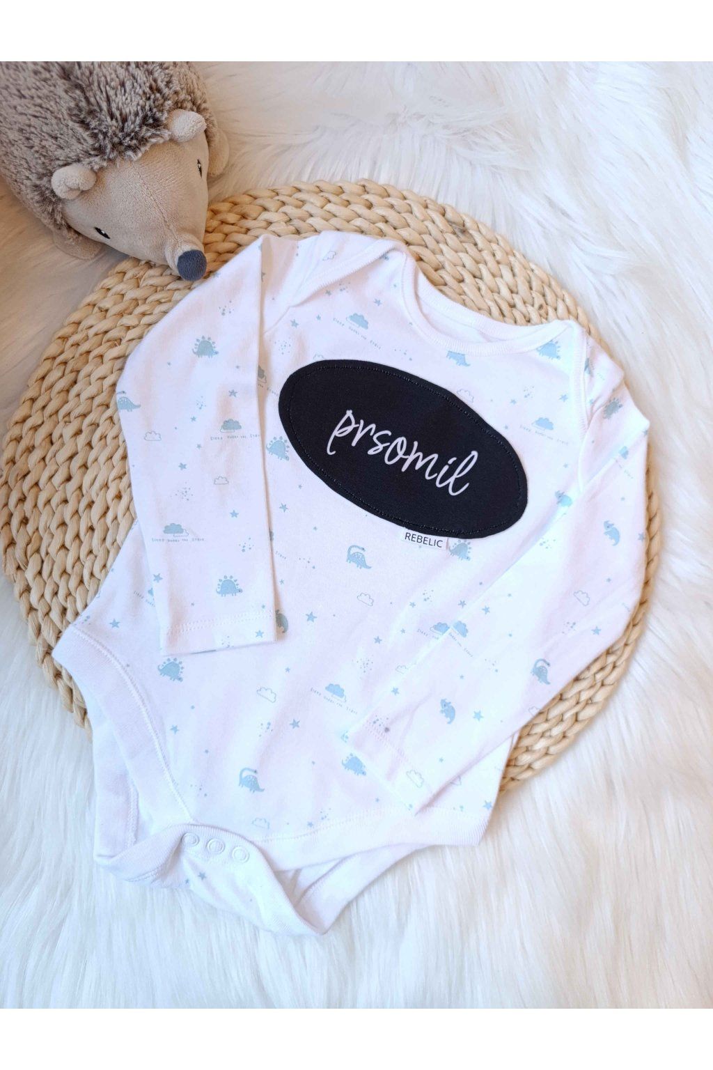 Hľadáte kúsok, ktorý s vtipom a láskou pomenuje to najsilnejšie bábätkovské puto? Naše biele body s jemným motívom modrých dinosaurov a úprimným nápisom „prsomil“ je presne ten kúsok, ktorý vyčarí úsmev na tvári každej mamičke. Výrazná čierna nášivka v minimalistickom ovále tvorí geniálny kontrast k hravému detskému vzoru a robí z obyčajného bodyčka originálny kúsok s jasným odkazom.
