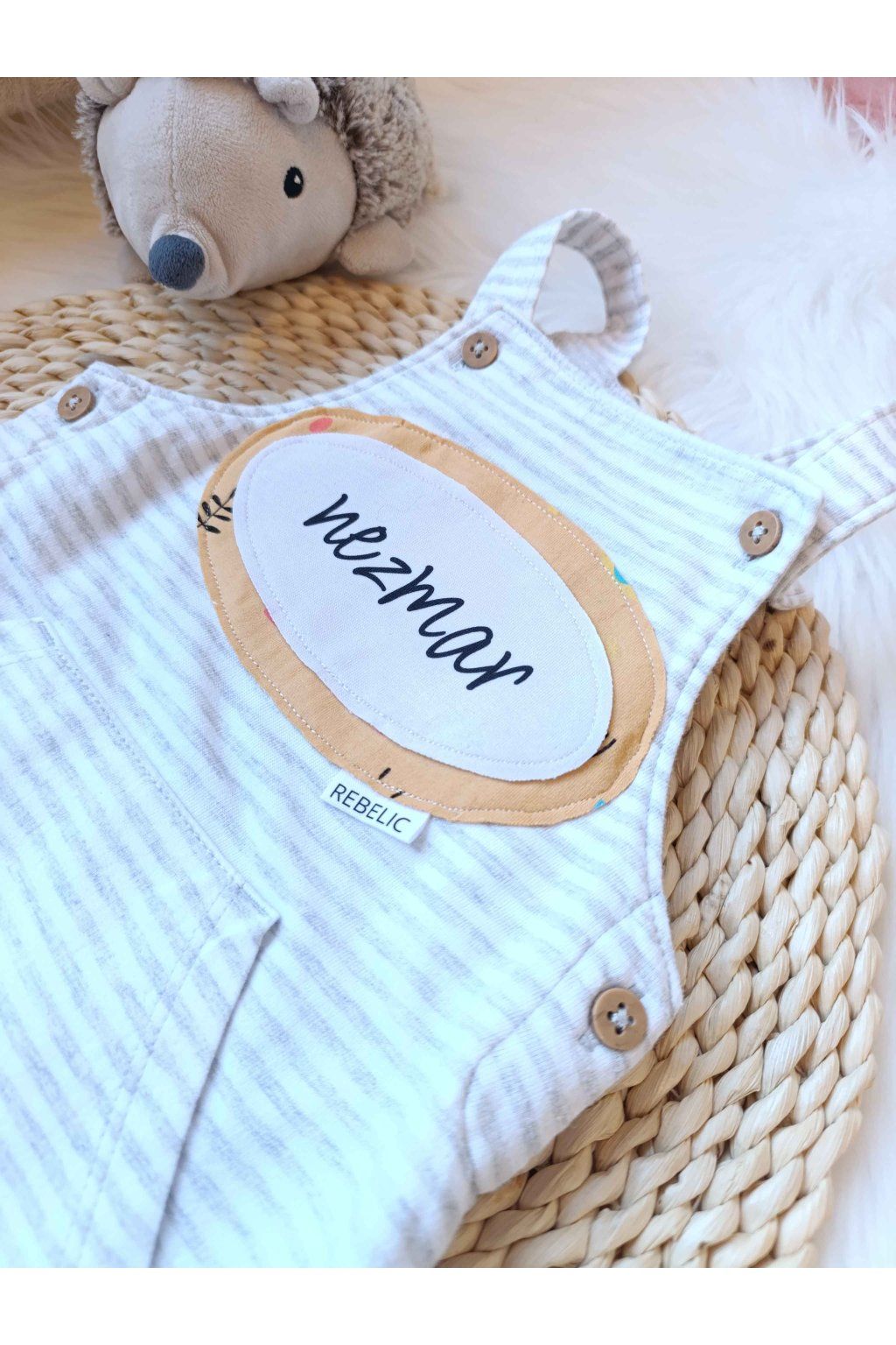 Originálny detail nášivky: Nápis „nezmar“ na bielom podklade je olemovaný hrejivou okrovou farbou s decentnými čiernymi vetvičkami, čo robí z dupačiek výnimočný kúsok.