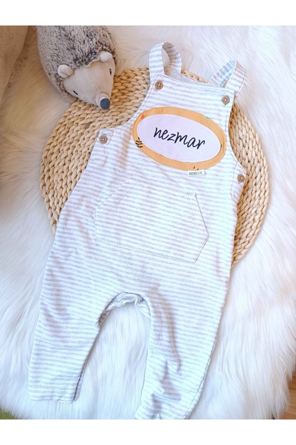 Praktické vrecká a detaily: Predné „klokanie“ vrecko a štýlové hnedé gombíky na trakoch dodávajú dupačkám ten správny detský šmrnc.