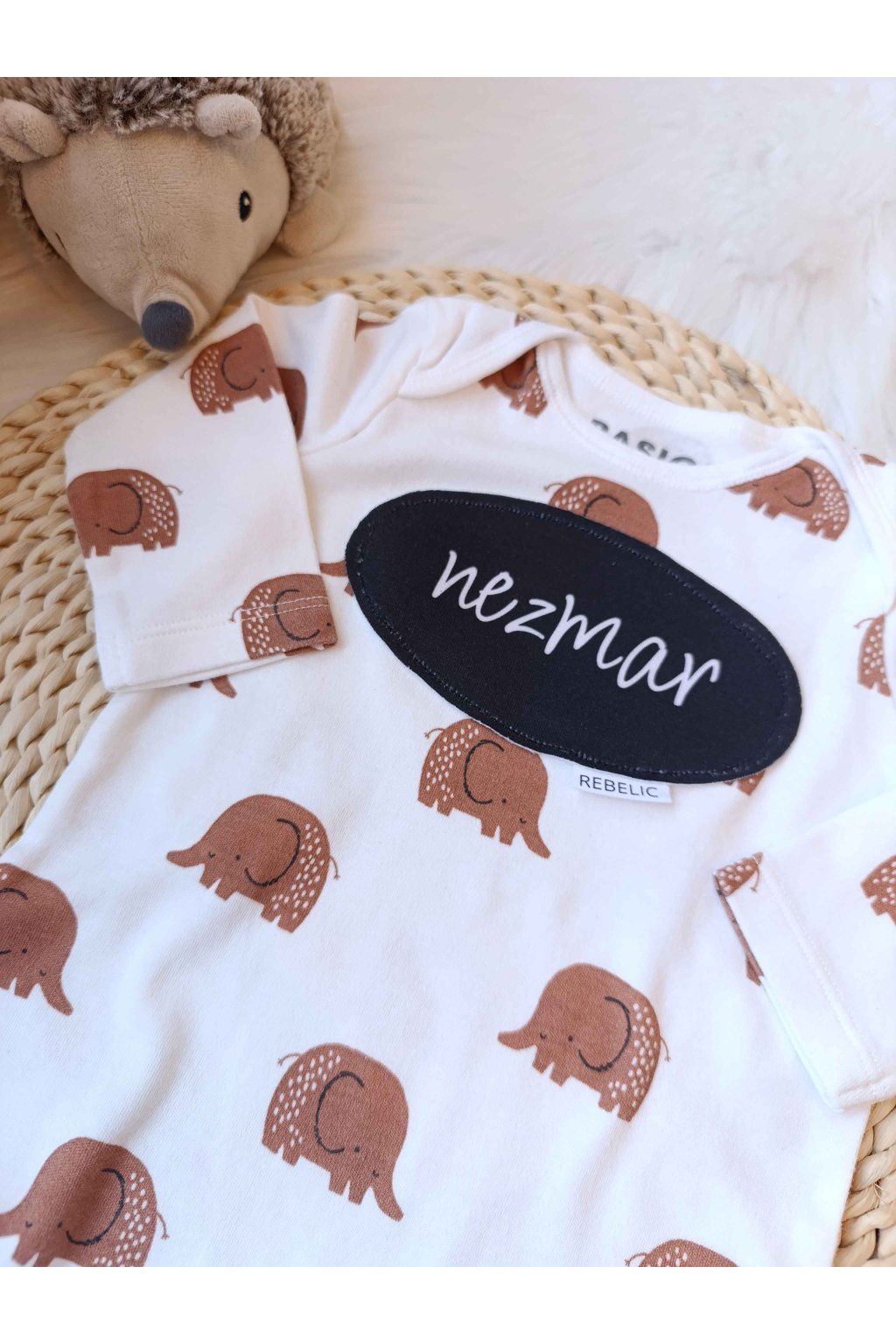 Hľadáte kúsok, ktorý spája hravý detský motív s poriadnou dávkou štýlu? Náš biely overal s celoplošnou potlačou hnedých sloníkov a nápisom „nezmar“ je presne to, čo šatník vášho drobca potrebuje. Dominantná čierna nášivka v minimalistickom ovále vtipne kontrastuje s milým vzorom a jasne hovorí, že toto bábätko má energie na rozdávanie.