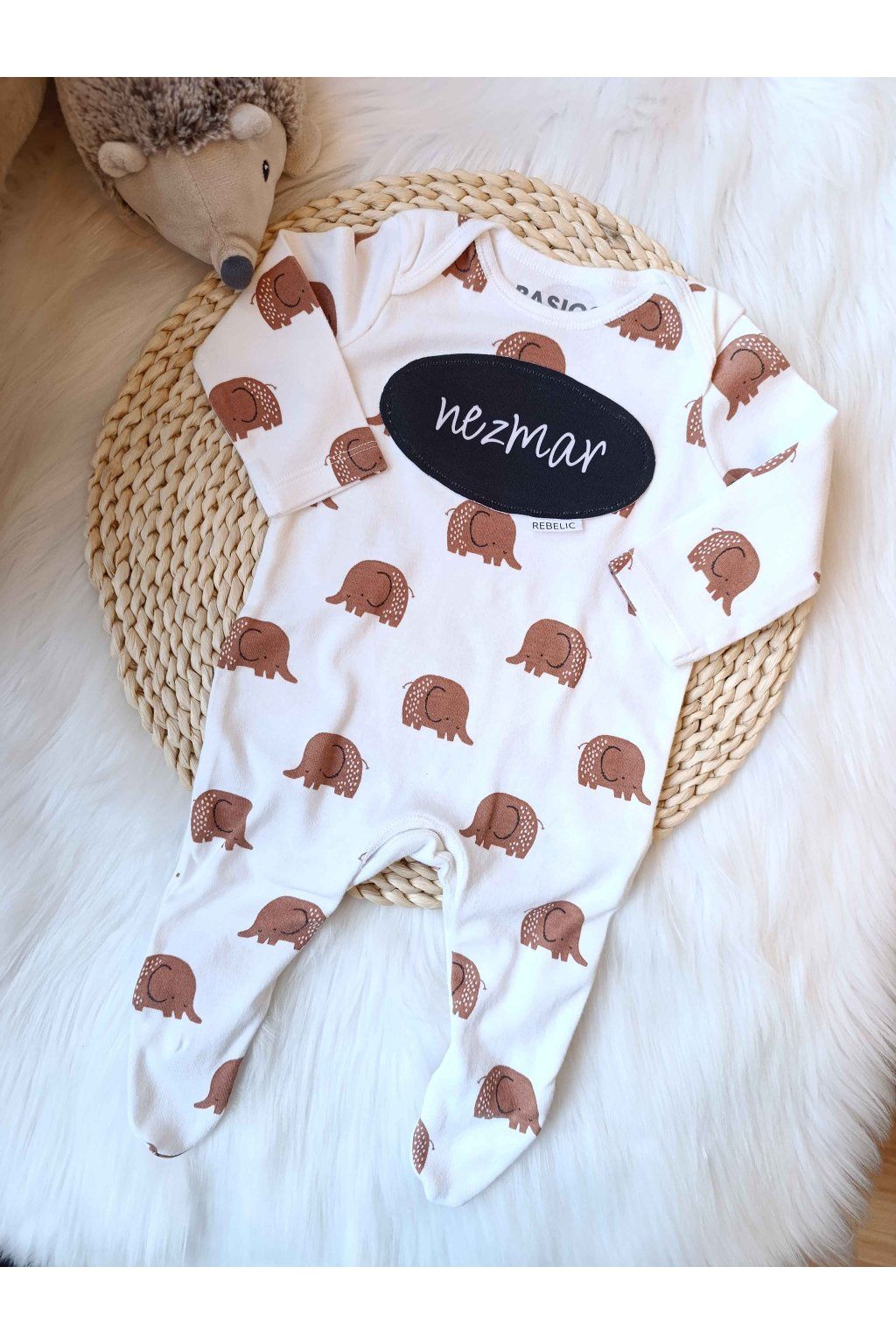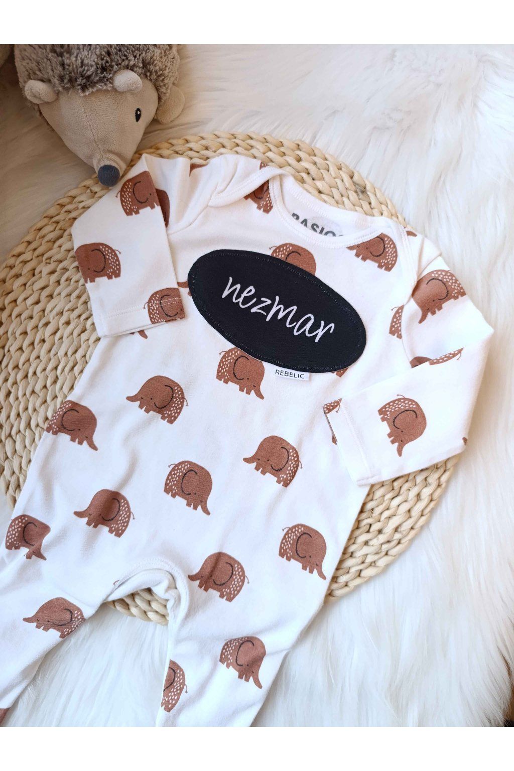 Hravý a milý motív: Drobné hnedé sloníky na bielom podklade dodávajú overalu nežný, no zároveň moderný vzhľad, ktorý pristane chlapcom aj dievčatám.