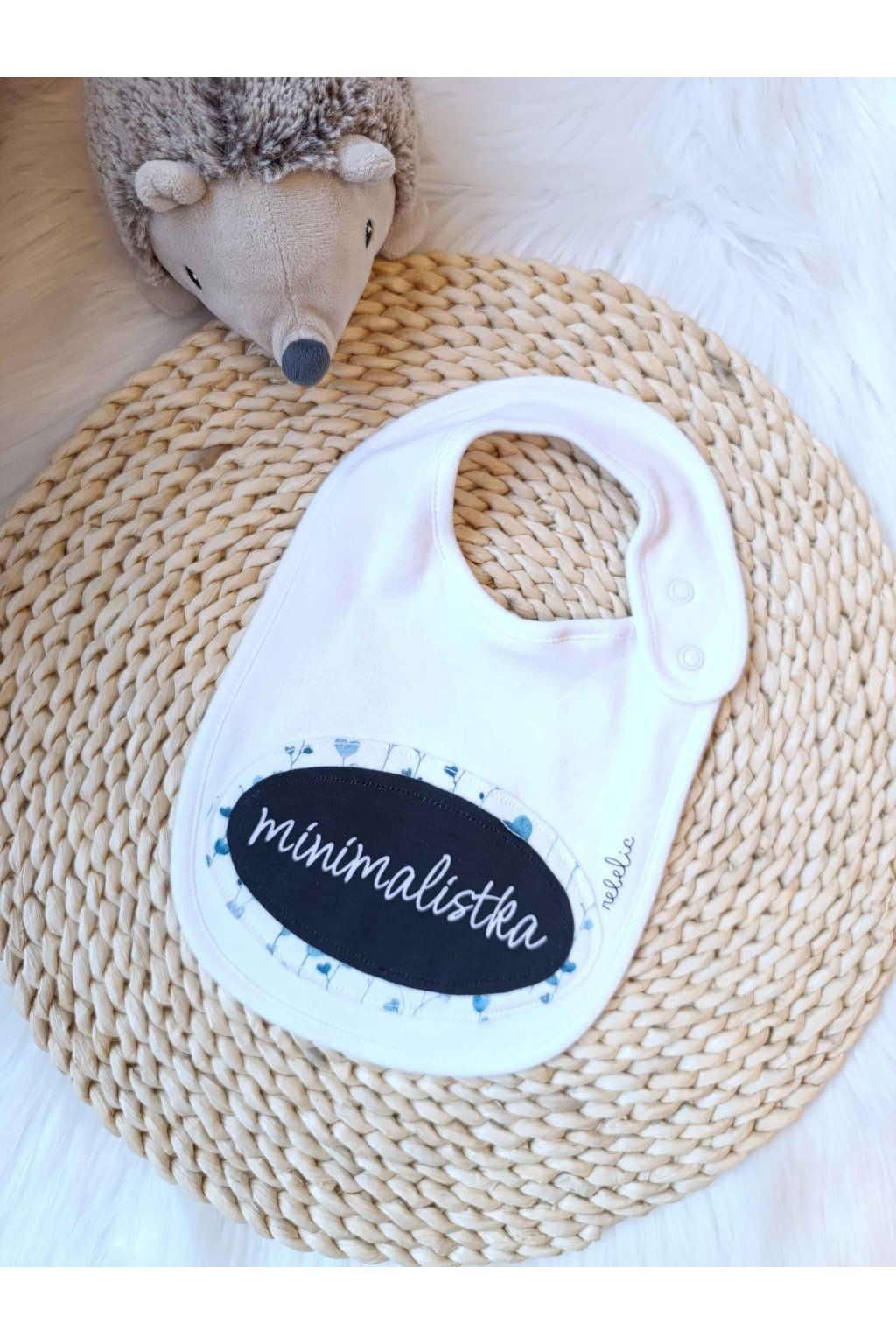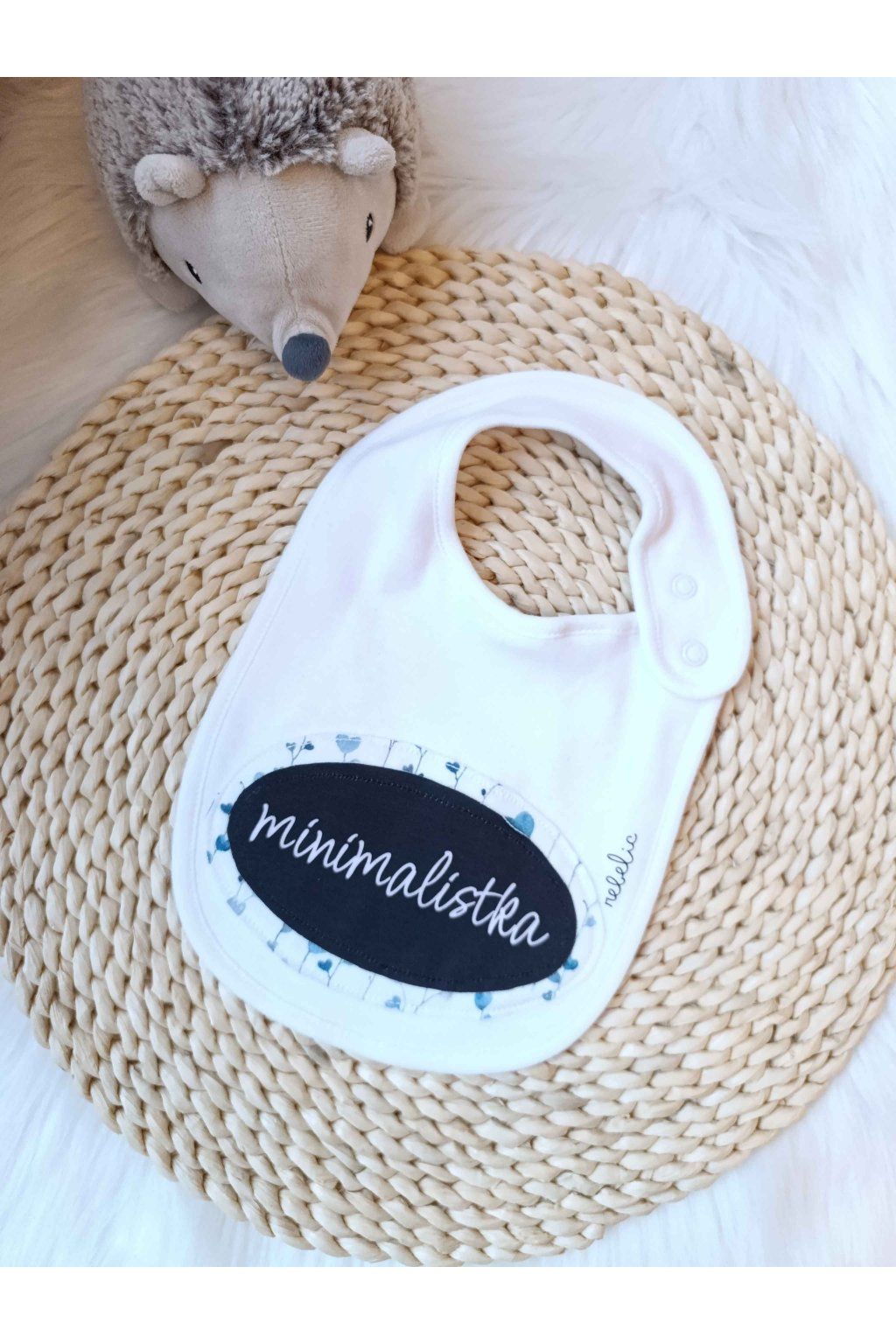Hľadáte praktický doplnok, ktorý nepokazí outfit, ale naopak mu dodá šmrnc? Náš čistý biely podbradník s nápisom „minimalistka“ je stvorený pre mamičky, ktoré si potrpia na estetiku aj počas kŕmenia. Výrazná čierna nášivka v minimalistickom ovále, olemovaná jemnými modrými srdiečkami a vetvičkami, robí z tohto podbradníka originálny dizajnový kúsok.